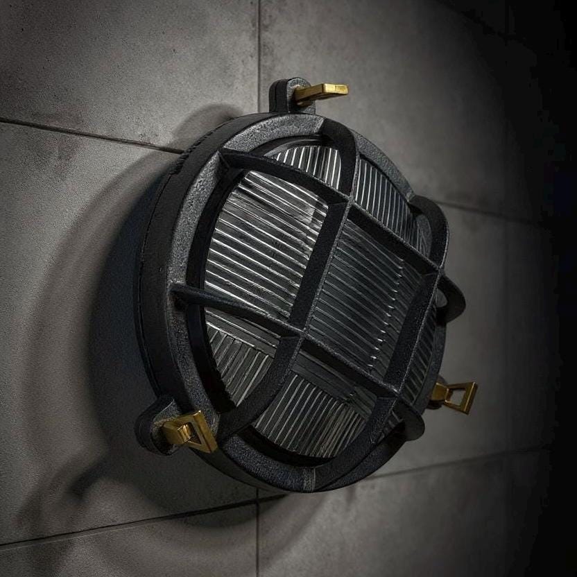 Add authentic industrial charm to your space with this vintage-style nautical bulkhead wall light. Featuring a durable metal housing with protective grid and a ribbed glass lens, this fixture was inspired by classic ship and marine lighting. Its rugged design makes it perfect for use as a wall sconce, ceiling light, or outdoor fixture, adding a bold touch of industrial, coastal, or rustic decor.