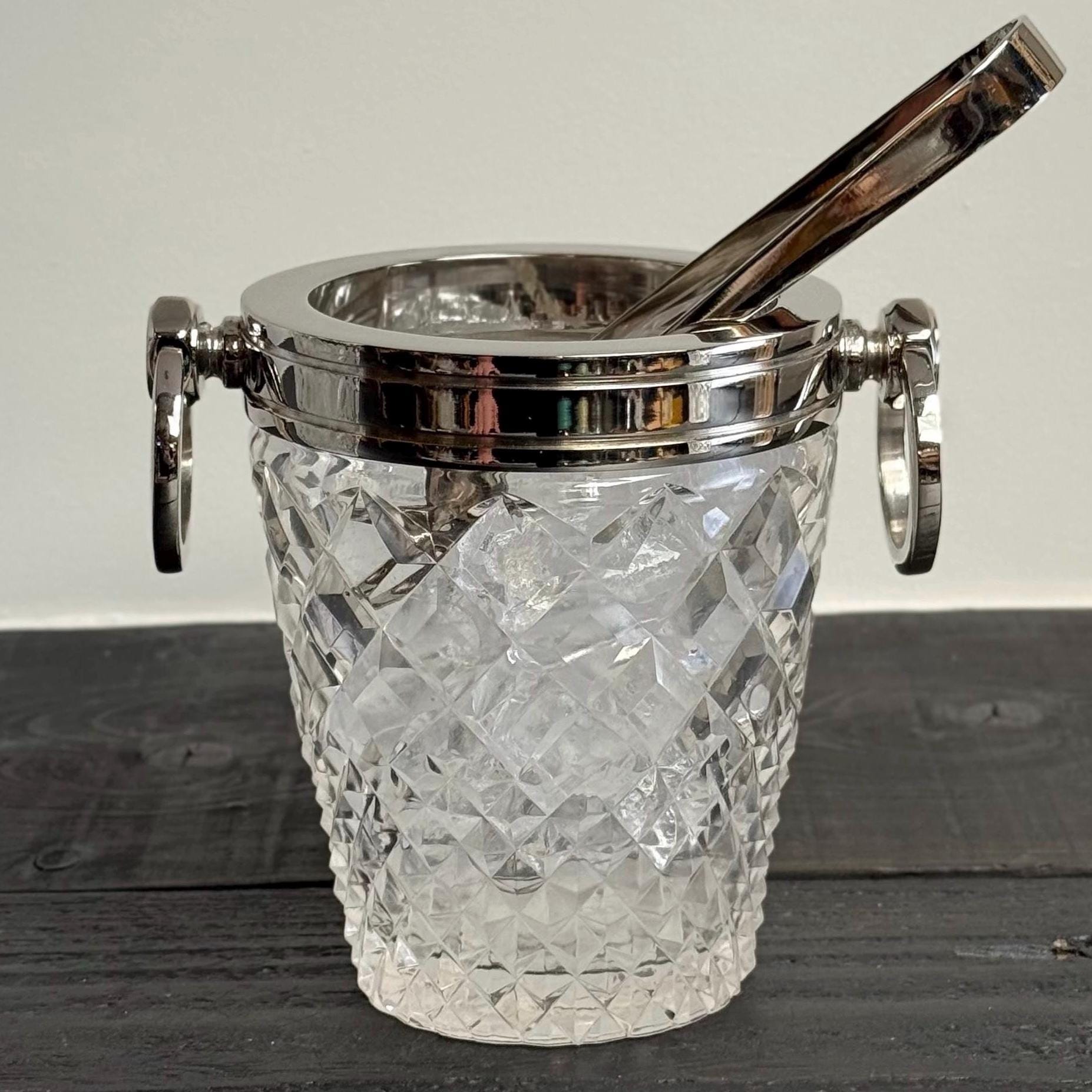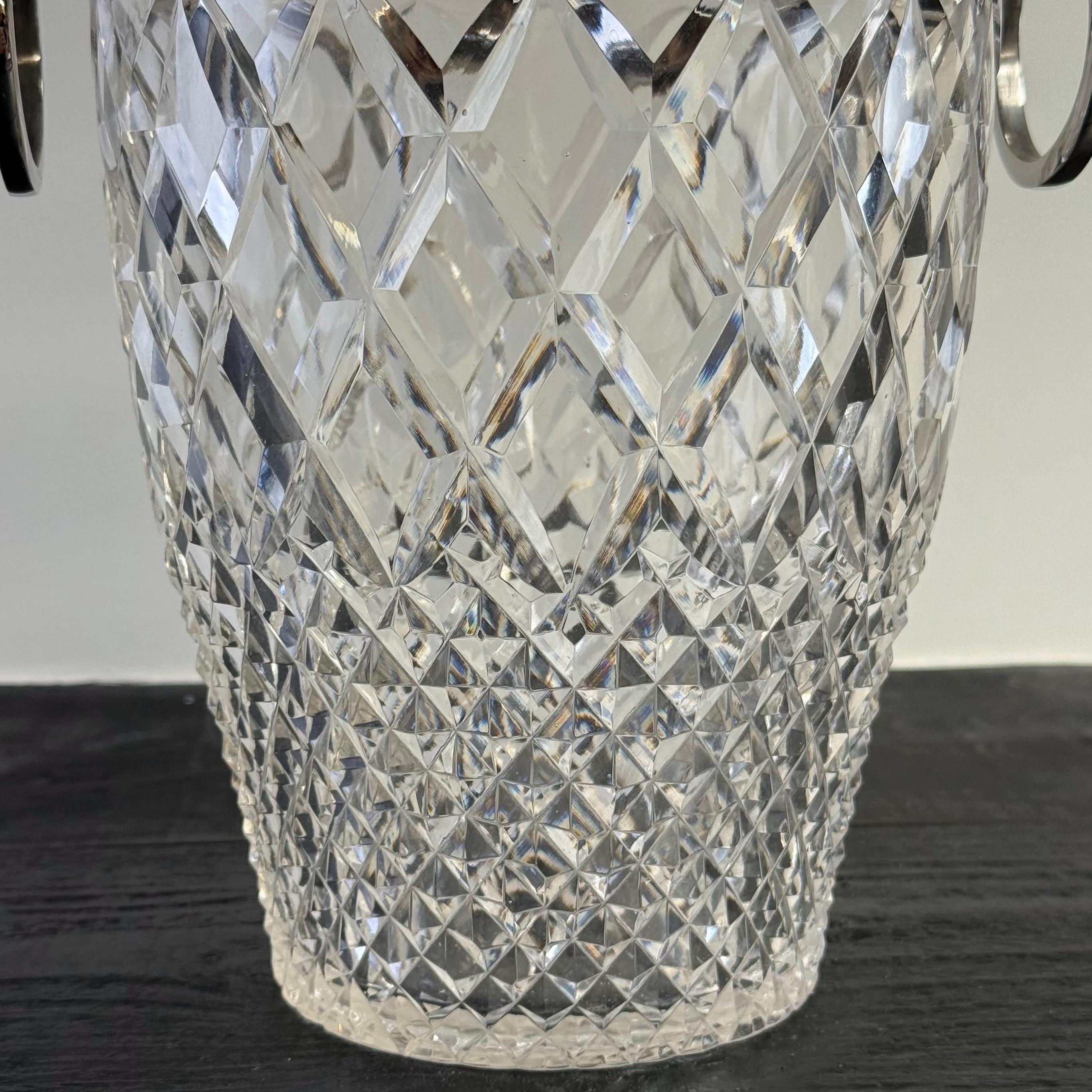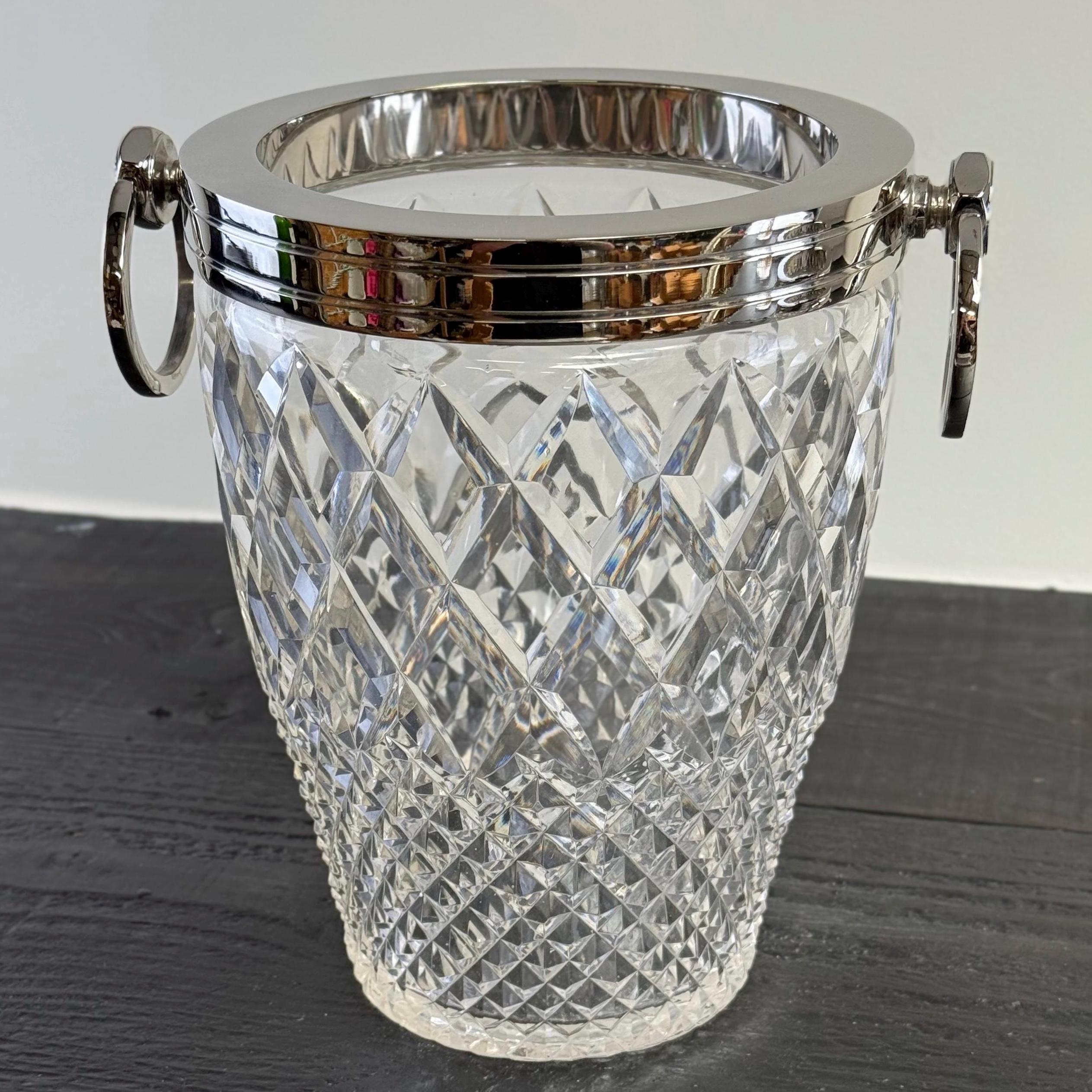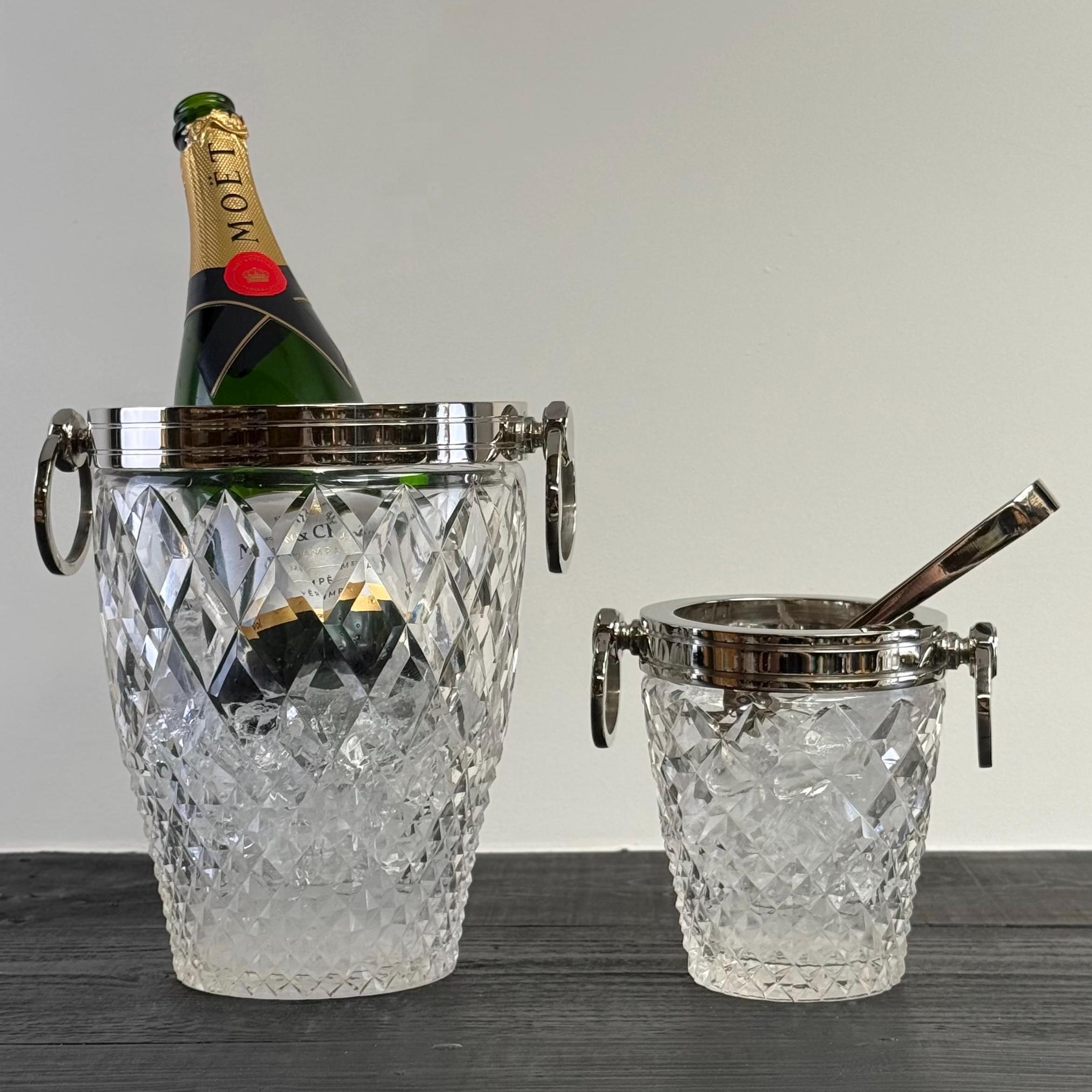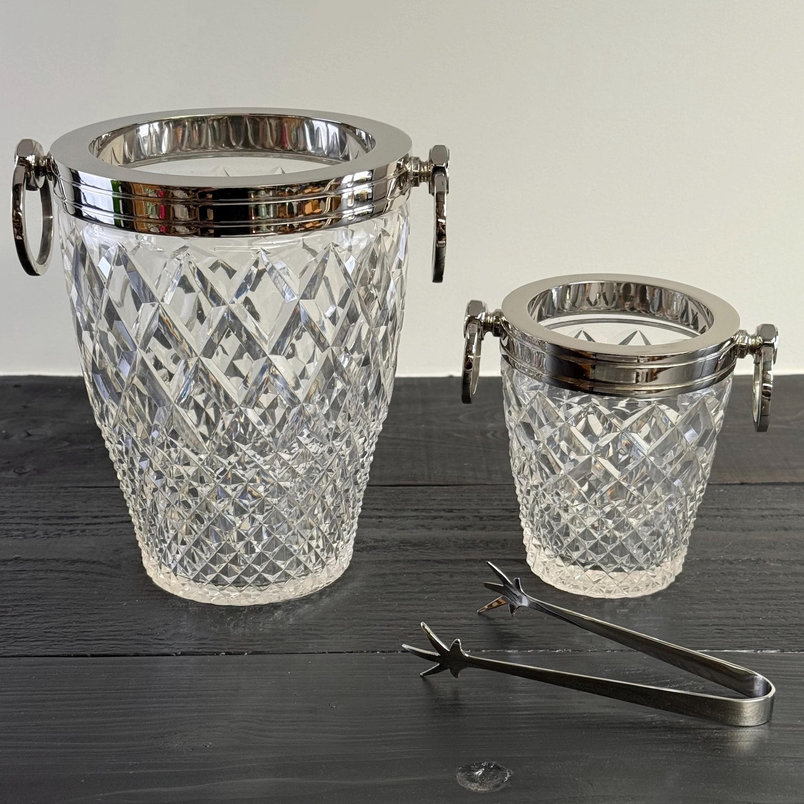 Stunning french silver plated and heavy cut glass ice buckets with large swinging handles.