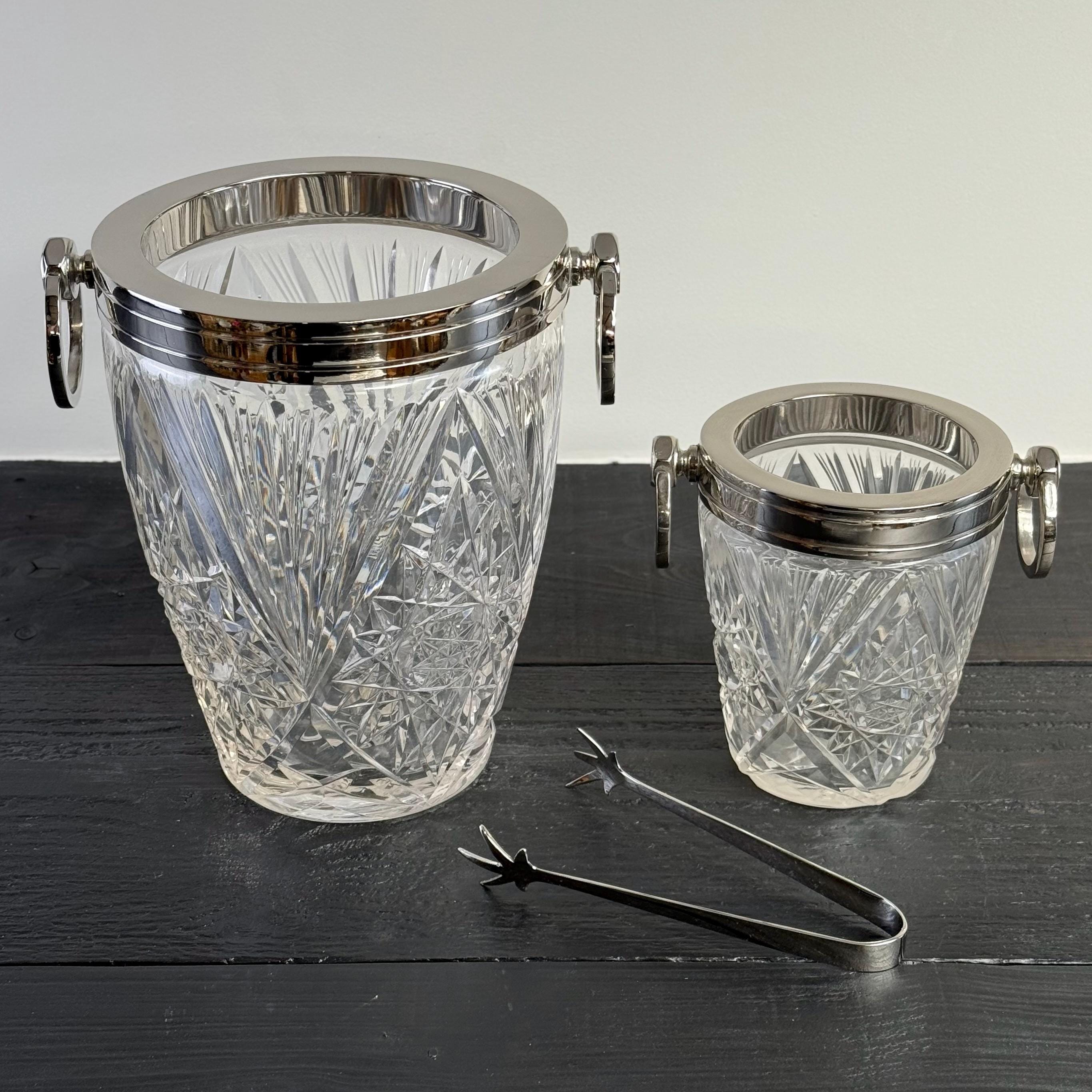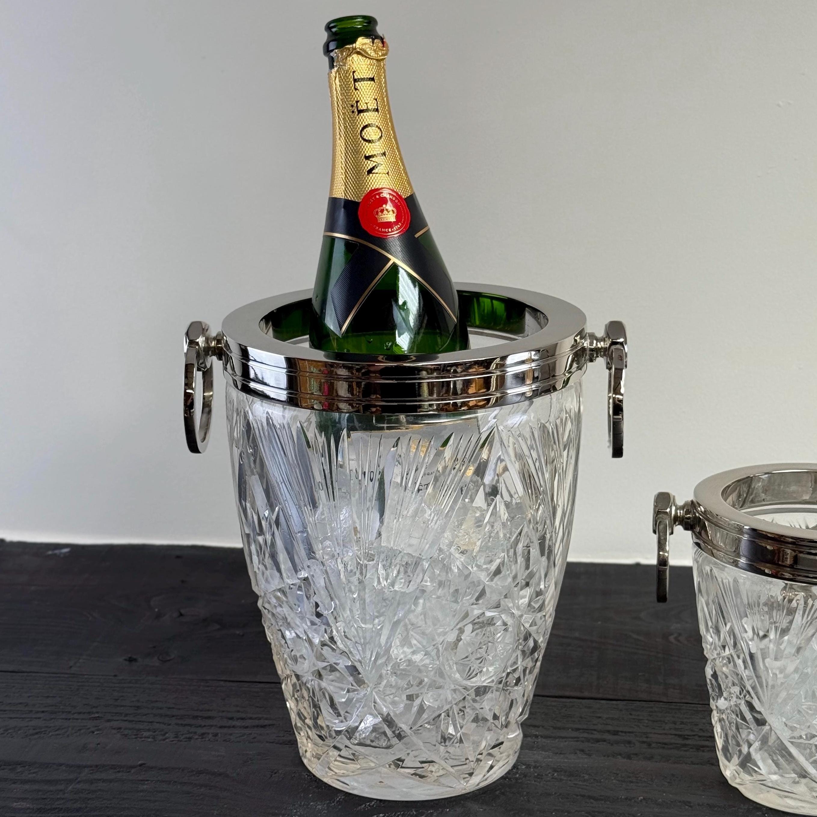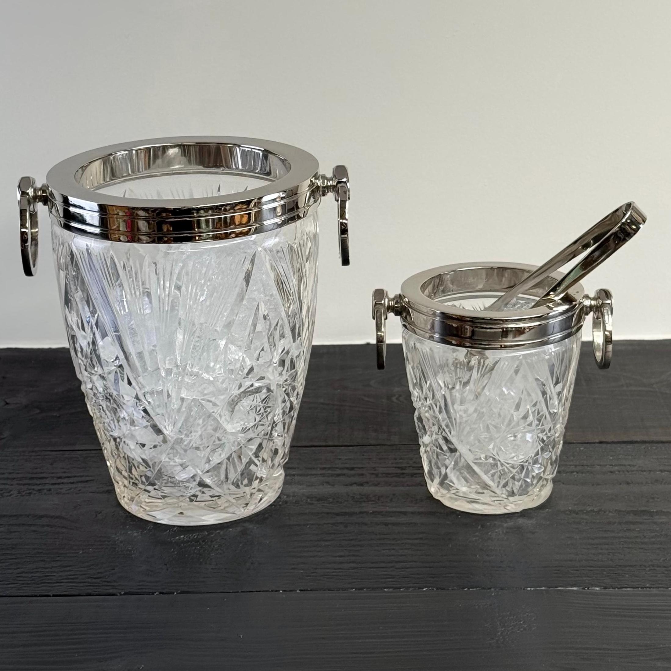 Stunning french silver plated and heavy cut glass ice buckets with large swinging handles.