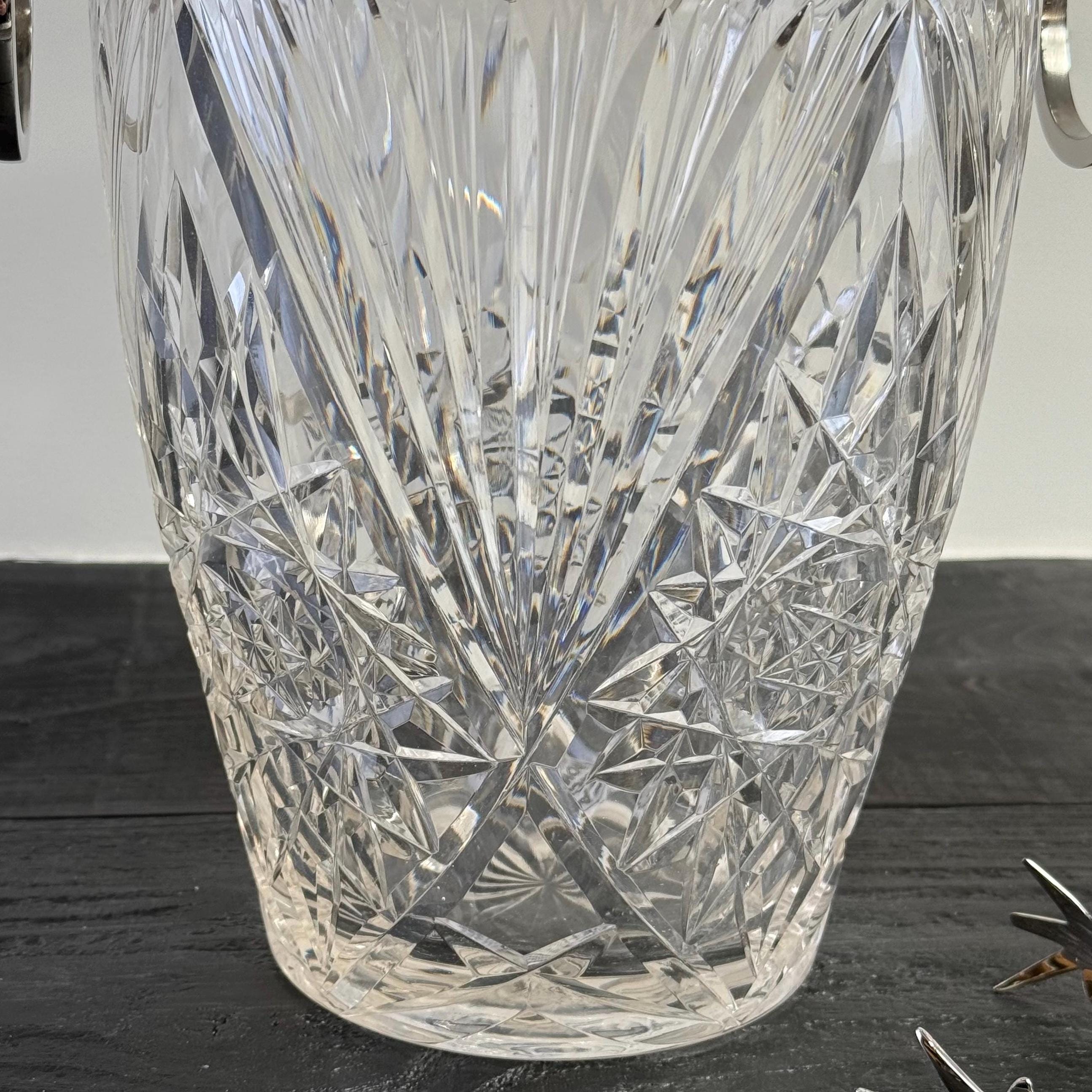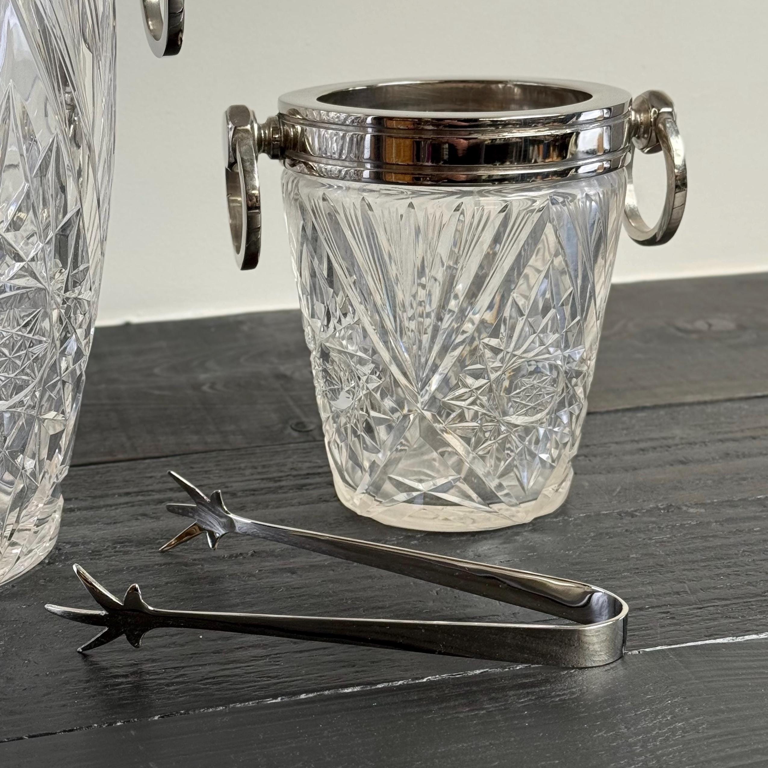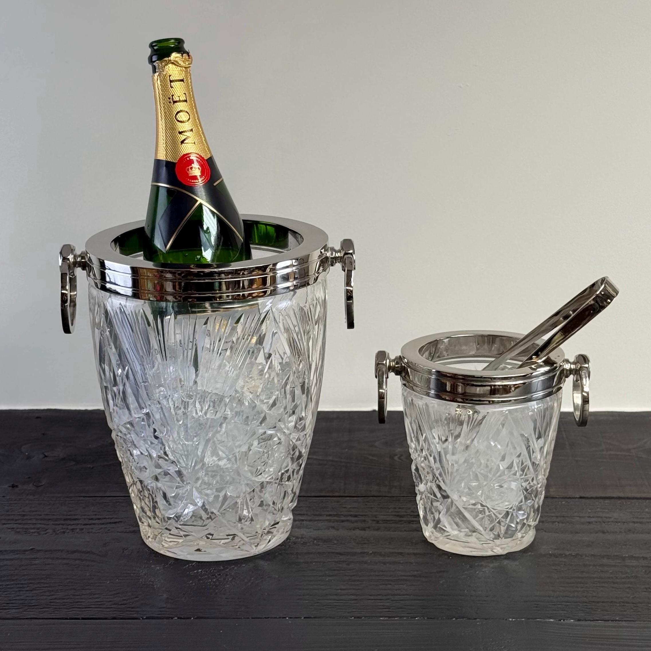 Stunning french silver plated and heavy cut glass ice buckets with large swinging handles.