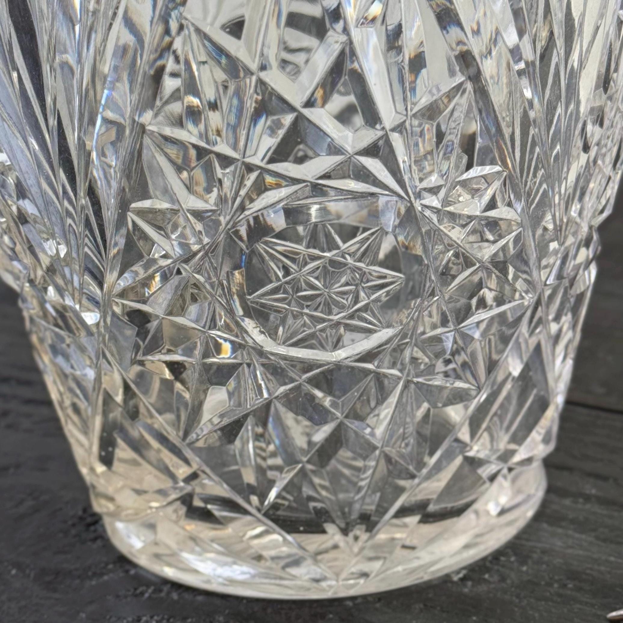 Very heavy handcrafted glass cut with inverted diamond style, the sides mounted with a plain c-shaped swinging handle.