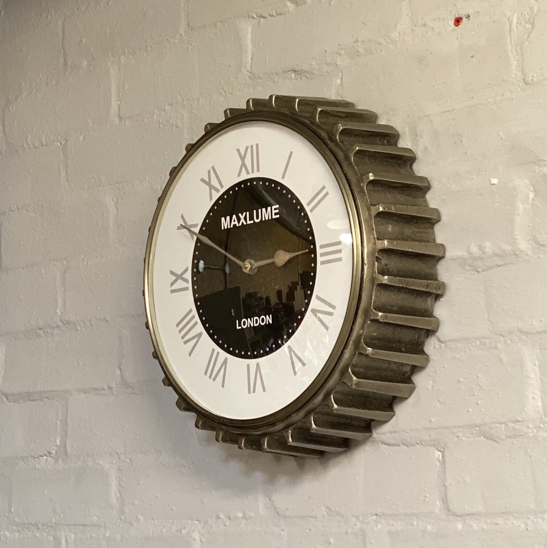 Solid cast aluminum, the asymmetrical design of the crank wall clock reveals the functionality.