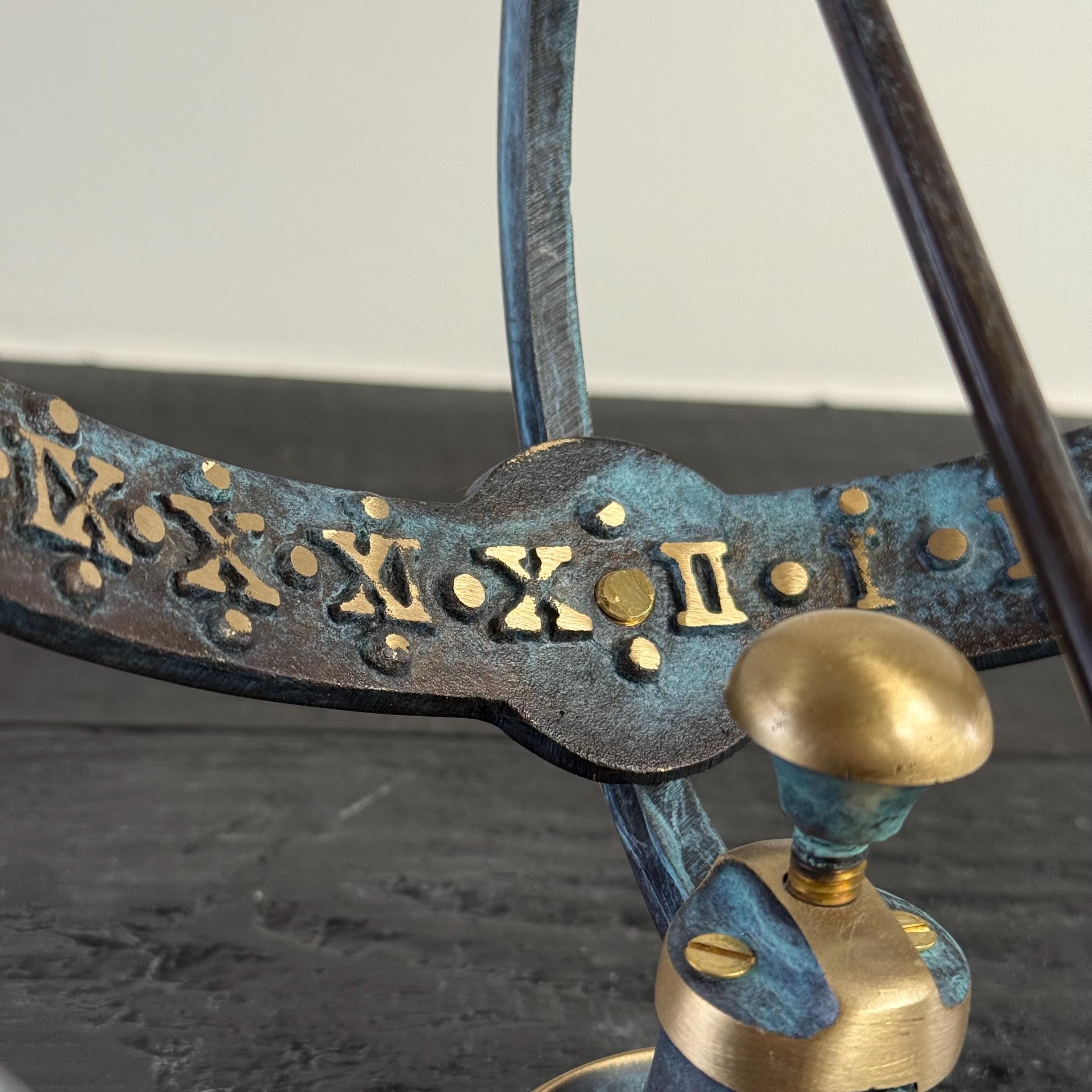 This beautifully handcrafted solid brass armillary sundial sculpture is a striking fusion of science, history and decorative art. Finished in aged brass with verdigris patina, it echoes the instruments once used by navigators and astronomers to chart the heavens and explore the world. A celestial statement inspired by maritime discovery & classical astronomy