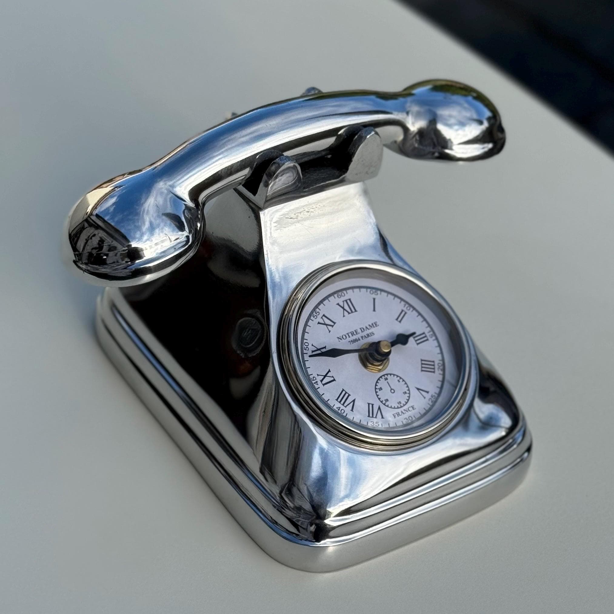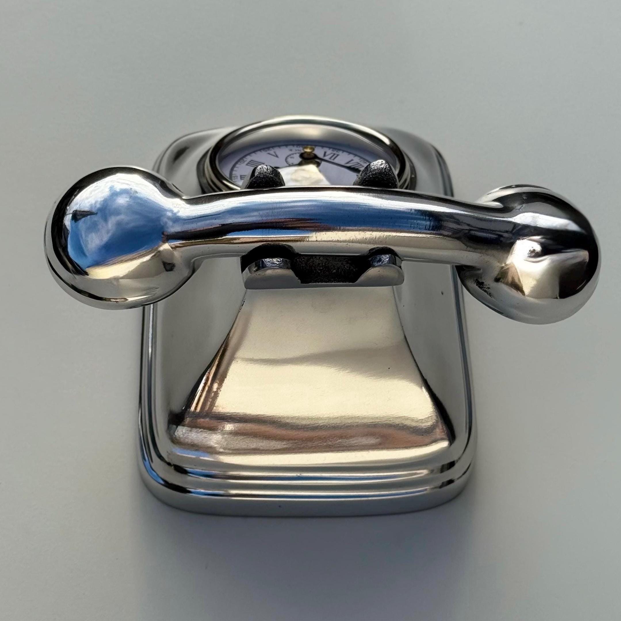 This is a vintage-style telephone that also functions as a clock. The design is reminiscent of early 20th-century telephones. It has a shiny polished nickel finish, giving it a sleek, modern look despite its antique inspiration.