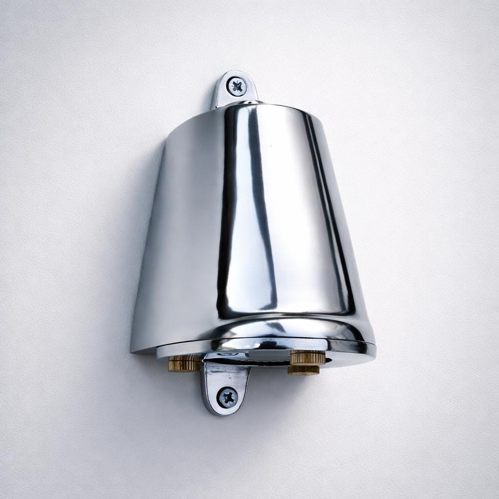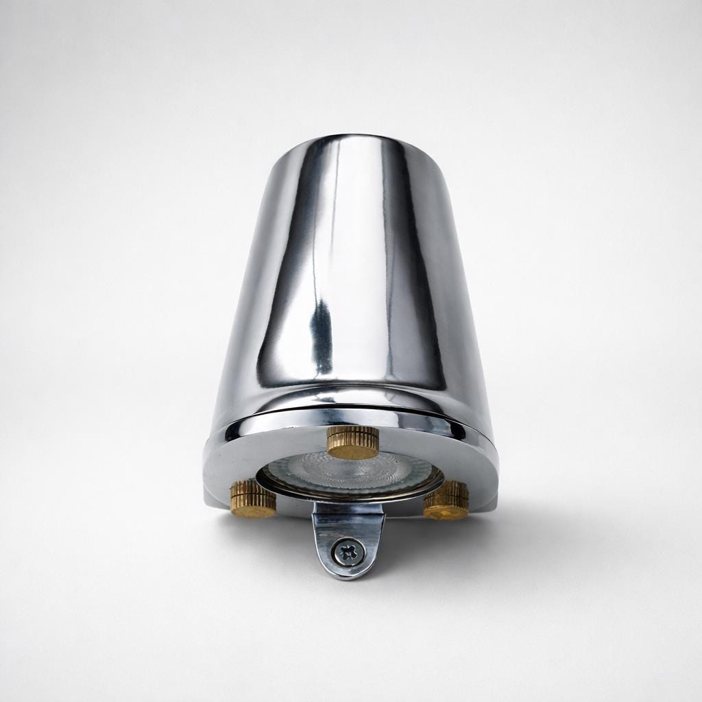Inspired by classic yacht fittings and polished deck hardware, this chrome wall light brings a refined marine aesthetic to both interior and exterior spaces. The smooth bell-shaped metal housing is finished in a high-polish chrome, echoing the timeless detailing found aboard luxury yachts and coastal residences.