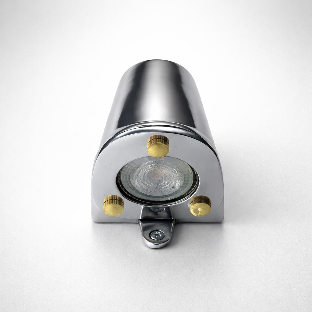 The solid metal construction is paired with a clear glass lens of the bulb, secured by knurled brass fixings, a subtle nod to traditional marine engineering. Designed to feel purposeful yet elegant, this fitting works beautifully Outdoor garden lighting, driveways, exterior walls, bathrooms, hallways, coastal homes, and hospitality settings seeking a quiet, nautical sophistication.