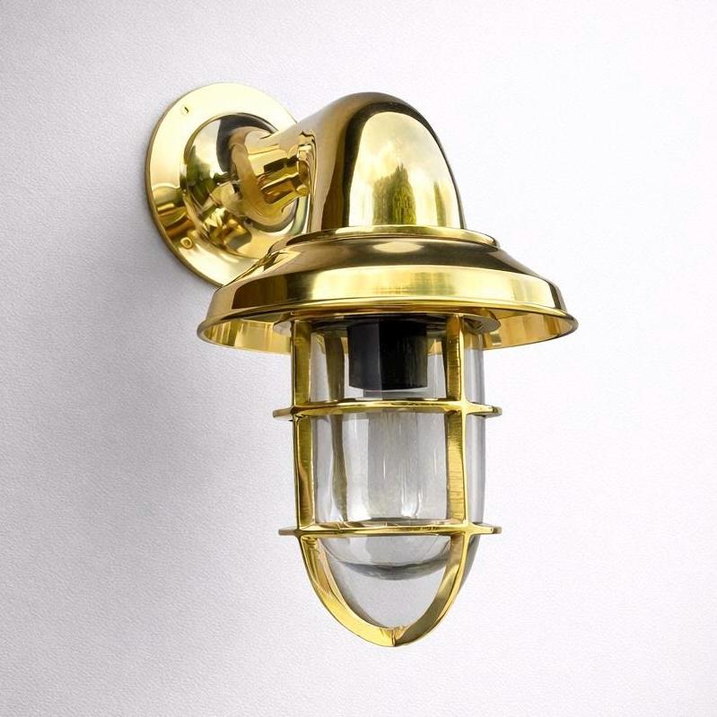 Crafted from solid brass with a highly polished finish, the fitting features a protective brass cage and clear ribbed glass diffuser, creating a warm, inviting glow while maintaining a robust, weather-resistant construction. The compact yet substantial form makes it ideal for exterior walls, garden rooms, coastal properties, bathrooms, and commercial spaces seeking a heritage aesthetic.