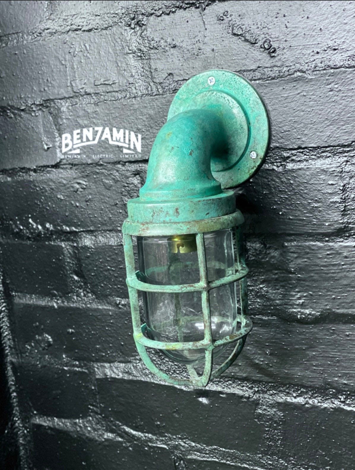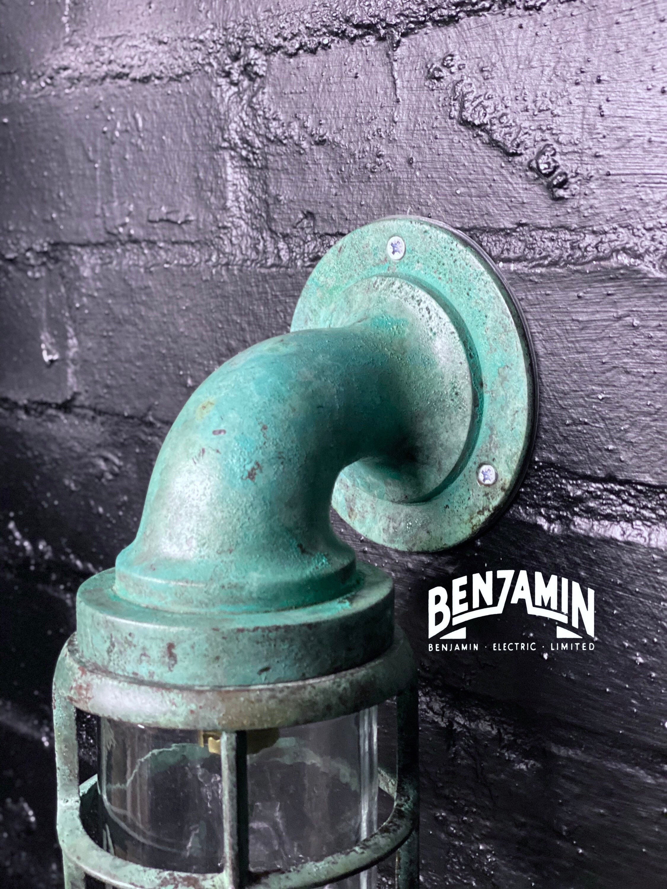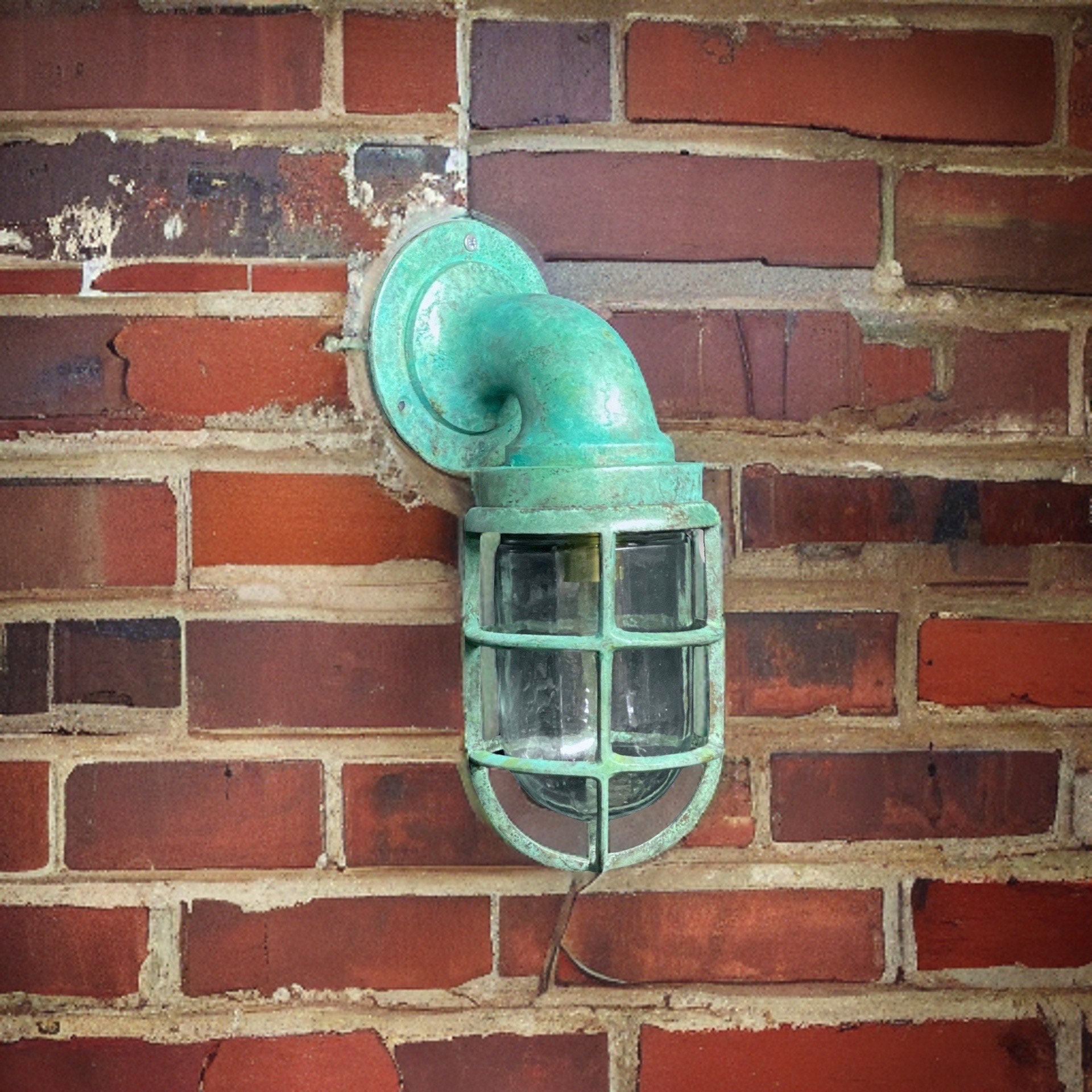 Solid Brass Verdigris Caged Bulkhead Industrial Wall Light | Bathroom | Outdoor Garden
