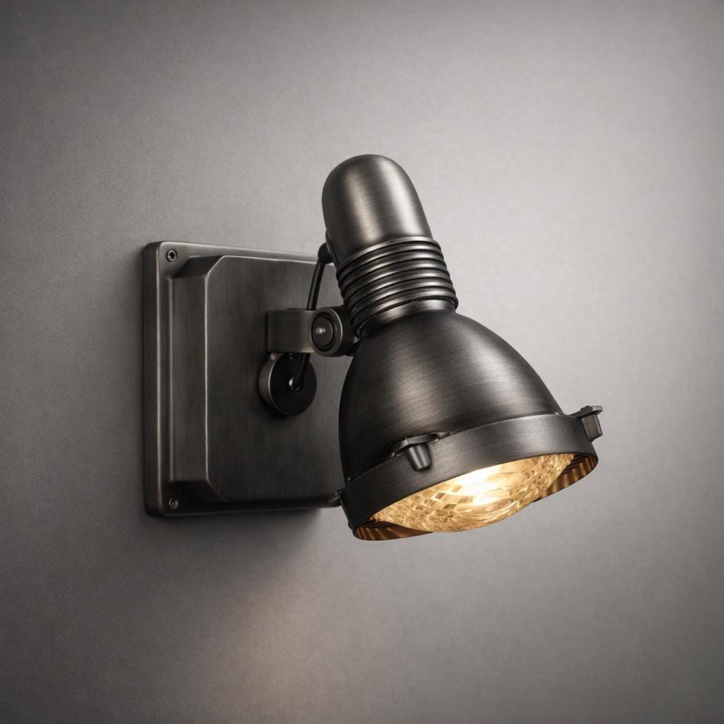 This adjustable wall spotlight features a robust square backplate and ribbed neck detailing, finished in a deep dark pewter tone for an authentic heritage aesthetic. The pivoting head allows precise angling, making it ideal for task lighting, artwork illumination, bedside reading, or feature walls.